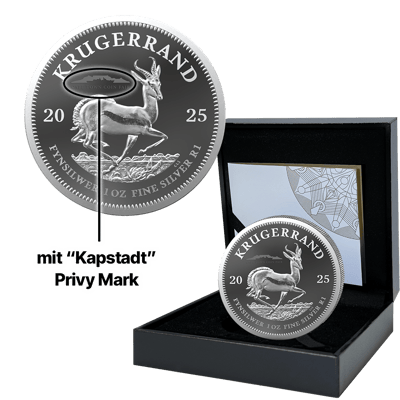 There are silver coins you buy – and those you secure before it's too late. The 1 oz Silver Krugerrand 2025 with the exclusive Privy Mark "Table Mountain Cape Town" undoubtedly belongs to the second category. With a worldwide mintage of just 1,000 pieces, this special edition is likely to sell out in no time. Those who hold it in their hands possess not only an ounce of finest silver, but a numismatic gem of extraordinary brilliance.